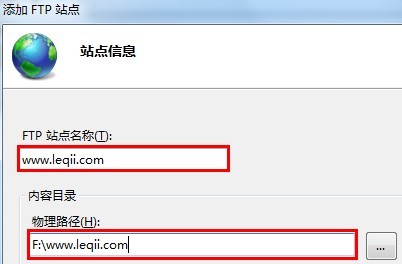 2、输入FTP站点名称(例如:www.leqii.com)
