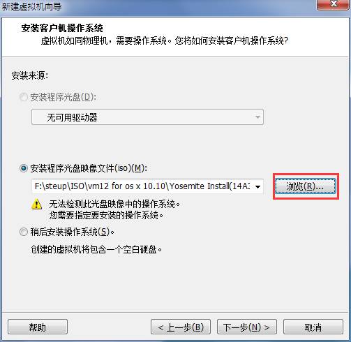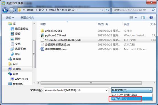 5、启动VM12pro虚拟机软件,新建虚拟机—典型安装—下一步—就可以看到 Apple Mac OX(M),要选对应的OS版本,这里是用10.10版本。CD\DVD里镜像选择下载的系统“Yosemite Install(14A389).cdr”,浏览时候可以选择所有文件可以看到.cdr文件。