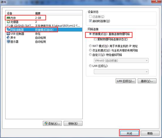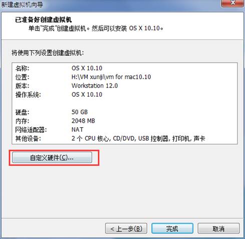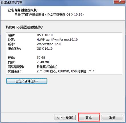 6、下一步—位置 浏览(随便你放哪里,最好选择无中文路径下)—下一步—最大磁盘大小我选50G,大点好,后面少了就悲剧—将虚拟磁盘存储为单个文件—自定义硬件—调整一下内存大小,建议用2G以上,网络适配器选“桥接模式”(这样设置苹果就可以上网),自定义好硬件,点关闭—完成。