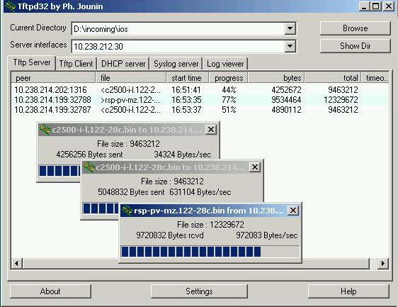Tftpd32是一个集成DHCP, TFTP, SNTP和Syslog多种服务的袖珍网络服务器包,同时提供TFTP客户端应用,支持tsize, blocksize 和 timeout等等。
