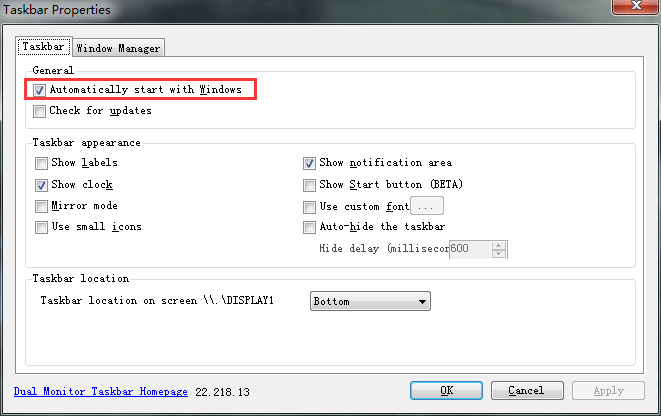 Dual Monitor Taskbar 1.22 版本是一款支持windows双屏显示器任务栏显示的软件,如果您是windows XP或者window7系统就可以使用这个软件来实现任务栏多屏幕显示任务栏,windows10系统是不需要这个软件的,因为windows自带多屏幕显示任务栏的功能。