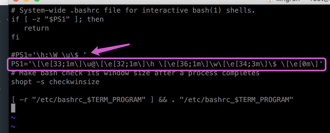 原理:这块字体内容的显示依靠系统读取文件bashrc来实现的,不同的系统可能会有差异,linux默认情况是读取用户下的~/.bashrc文件来实现,然而默认的~/.bashrc文件里面写了包含/etc/bashrc,两者存在关联性。mac os x没有~/.bashrc这个目录,mac直接读取/etc/bashrc文件来实现。下面将会分别讲解centos、ubuntu、mac os x等系统配置。
