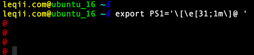# 解释:设置当前登录的用户名为红色,后面有空格隔开,回引号前方有个空格,这样写的话,后面输入的代码会跟前面的颜色相同,后续会讲到怎么设置输入的字符颜色。