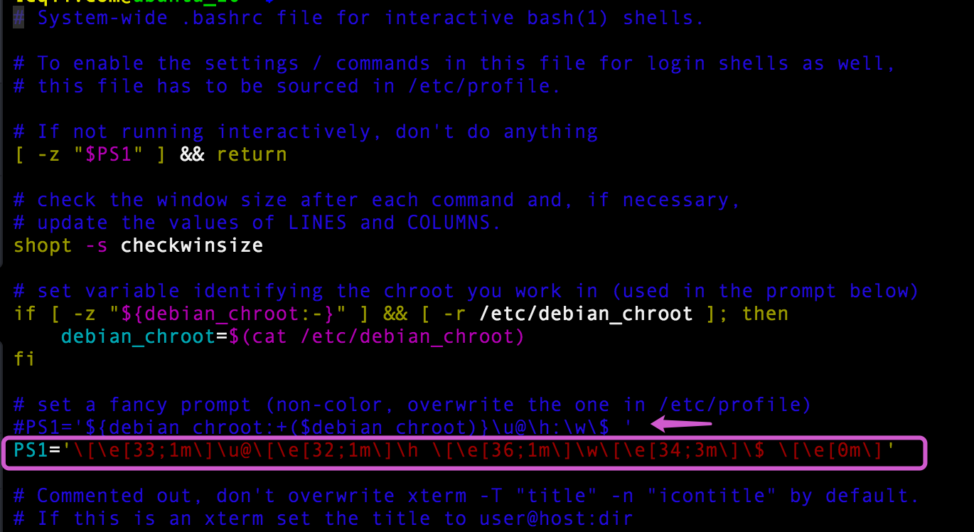 注意:ubuntu需要修改2个文件,修改/etc/bash.bashrc文件(这个不改,新用户在系统重新启动后是无法加载到效果的),且修改登录的用户的 /home/user/ 的 ~/.bashrc 文件 。