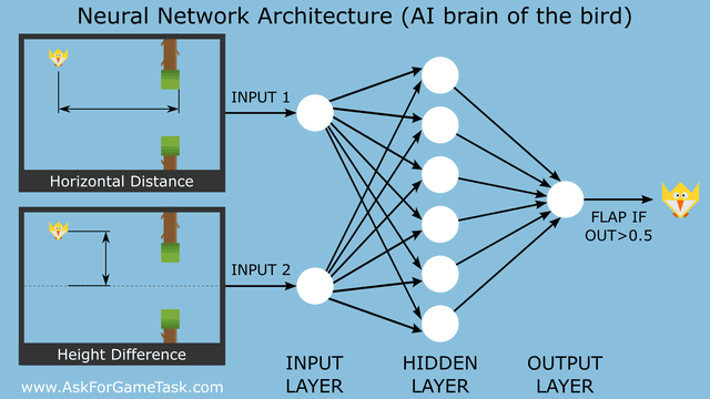 在这个项目中,每个单元(也就是每个鸟)拥有其自己的神经网络来作为游玩游戏的大脑,每个神经网络包含以下三层: