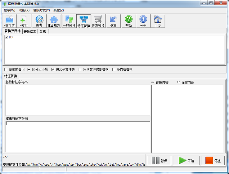 UltraReplace绿色版是一款很实用的超级批量文本替换软件,是文本替换的利器,批量文本替换的不二之选,站长必备,挂马网页杀手,支持所有纯ANSI文件,支持GBK/Unicode/UTF8编码的后缀为txt、htm、html、asp、java、php、h、c、hop、dpr、cgi、ini、bat、py、dfm、sql、js等文件,可自定义所支持的文件类型,支持16进制替换,支持单行和多行以及段落替换,支持特征替换和提取,支持正则替换,支持多规则同时替换并可以行导入规则,智能规则排序功能,支持多级目录、大小写匹配、支持备份和恢复,替换速度快。